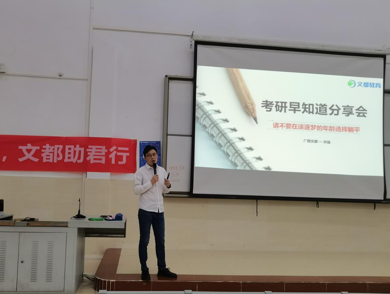讲座一开始,“请不要在该逐梦的年龄选择躺平。”主讲人文都考研专业规划师孙强抛出了这样一句话,鼓励同学积极向上,激发了同学们的现场热情。主讲人孙强凭着自己12年的考研培训行业经验,向同学们讲述了考研的意义与就业前景,帮助同学们理清考研的动机。通过分析部分高校历届分数线与招生情况,带领大家充分认识当前考研形势,帮助同学们确定目标,提升对自己的能力及自己对未来出路的认识。并对如何选择院校与专业;如何在各个阶段进行高效备考等方面提出了建议;最后还分享了一些答题拿分技巧及学习方法,为同学们指明了学习的方向。