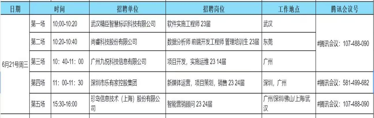 参与此次招聘会的用人单位有武汉精臣智慧标识科技有限公司、尚睿科技股份有限公司、广州就悦科技信息有限公司、深圳市乐有家控股集团、珍岛信息技术(上海)股份有限公司等5家企业,招聘软件实施工程师、数据分析师、前端开发工程师、管理培训师、项目开发、实施运维、新媒体运营、项目策划、销售、智能营销顾问等10个岗位,提供就业岗位20个。