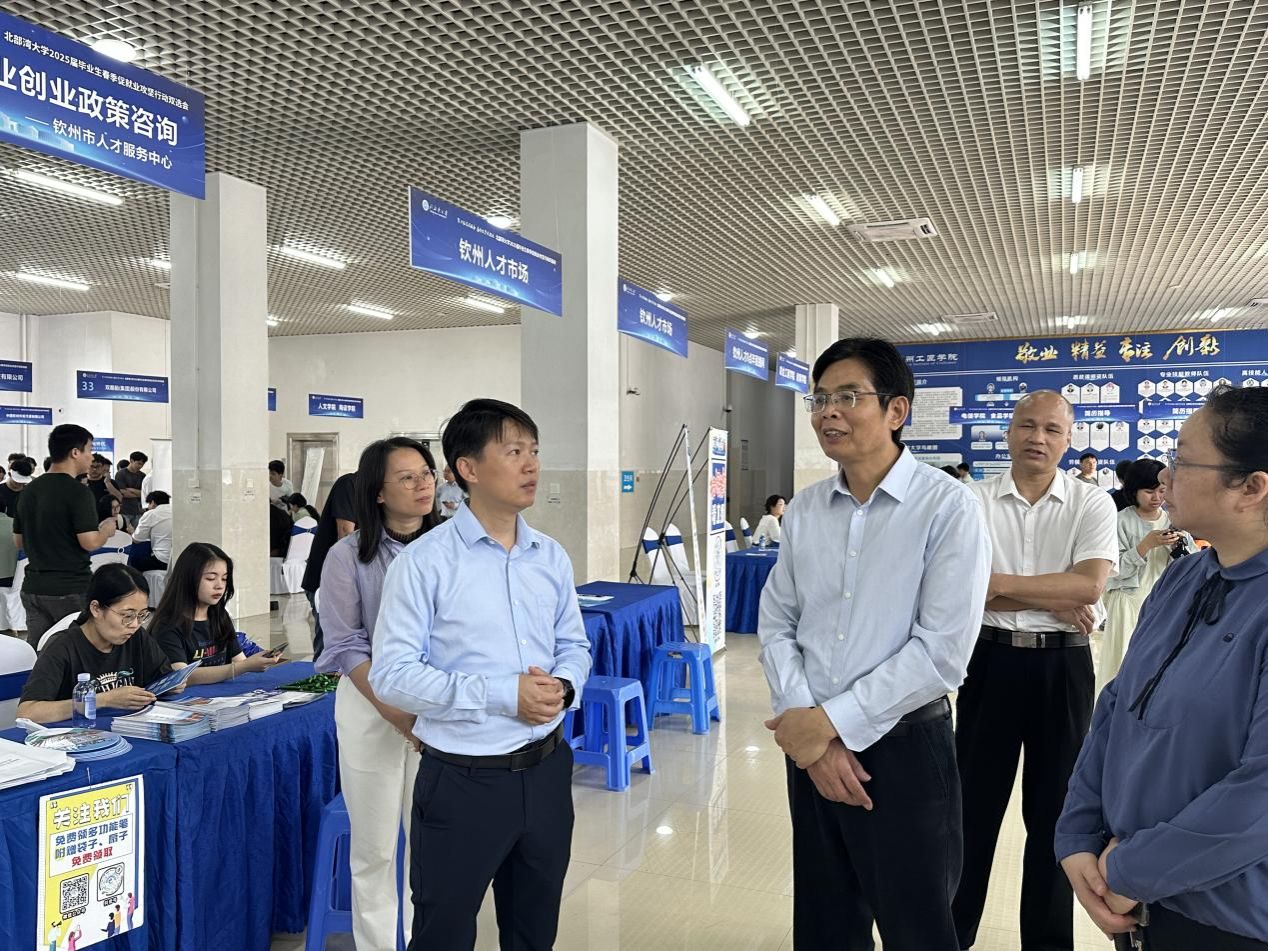 本次双选会由北部湾大学、钦州市人力资源和社会保障局联合主办。市人力资源和社会保障局党组书记、局长、市二级巡视员、市委组织部副部长(兼)黄宗旺,校党委常委、副校长马秀明,各二级学院学生工作分管领导参加双选会,与用人单位负责人深入交流,详细了解招聘进展。马秀明副校长走访广西绿源电动车有限公司、广西植护元创纸业有限公司、凭祥市爱瑞斯科技有限公司和广西华祥科技有限公司展位,就“访企拓岗”合作事宜进行深入探讨。