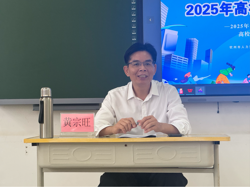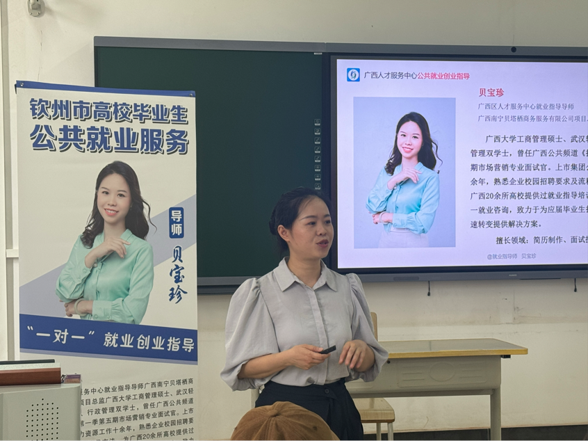 4月22日下午,我校在12号教学楼311多媒体教室开展2025年钦州市人社局长进校园暨高校毕业生就业创业指导活动,市人力资源和社会保障局党组书记、局长、市二级巡视员、市委组织部副部长(兼)黄宗旺出席活动并作主题宣讲,就业创业指导老师贝宝珍作“现场求职面试技巧”主题讲座,全校各学院学生代表参与。